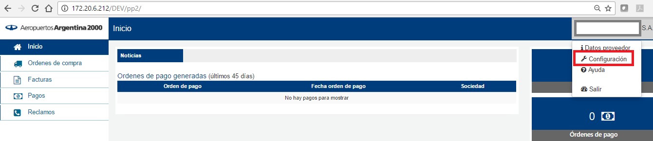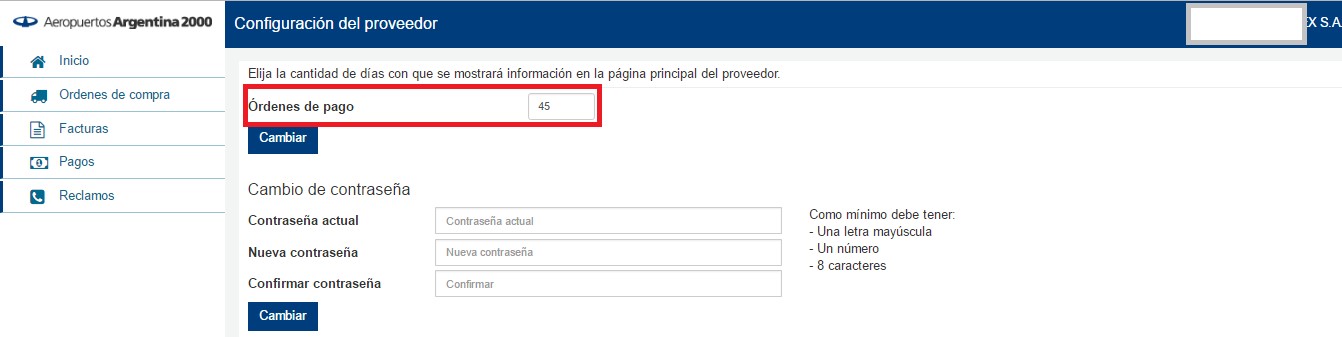 Los días de visualización en el “Inicio” se configuran desde las opciones del proveedor, a través del botón “Configuración” como se muestra a continuación: