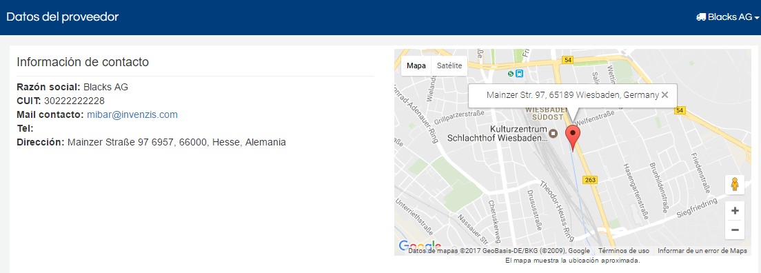 Aquí obtendremos los datos de contacto con el proveedor como son razón social, CUIT, Mail, Teléfono, Dirección, condiciones de pago y vías de pago.
