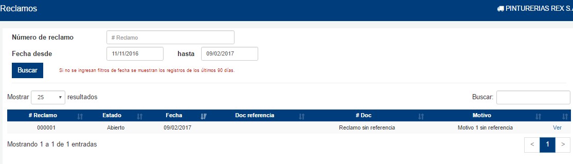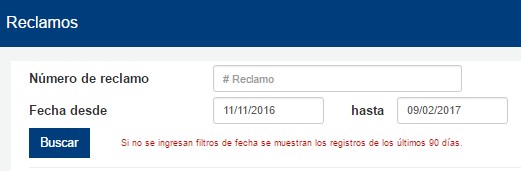 Una vez que se haya ingresado a dicha opción del menú, se podrá realizar la búsqueda en base al número de reclamo o fecha de creación del mismo. Si no se ingresa una fecha, se visualizaran solamente aquellos registros de los últimos 90 días.